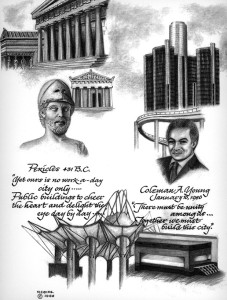 On the left you can see a drawing of a helmeted Pericles with the Parthenon behind him, and in roughly the same configuration on the right hand side, is an image of Young backed by the General Motors Renaissance Center. The RenCen, as it is affectionately known, was built by Henry Ford II in 1977. The building complex (a city within a city) is the tallest building in the state of Michigan.