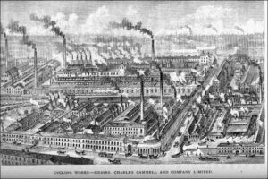 ‘This vast establishment comprises almost a small town of factories, the premises occupying an area of upwards of fourteen acres of ground, and affording employment to over 1200 persons, the amount of whose annual wages exceeds the revenues of many a foreign principality… After passing through an almost interminable succession of buildings occupied by swarthy workmen, engaged in their Titanic operations, we arrive at a series of very large buildings of more recent construction, consisting of rolling-mills, tilts, forges, and grinding wheels; and here the mighty power of machinery in its most gigantic proportions will astonish the beholder. The rolling-mills are so extensive as to require the agency of a pair of engines which together exert the power of nearly 500 horses; there is also an engine of immense capability for driving grindstones and other machinery required for the general purposes of the trade, and additional engines of proportionate power for hammering, tilting, forging, and drawing. The men engaged on these premises are models of herculean hardihood, so much does muscular exercise, even of the rudest and most severe character, develop the bodily frame. The hearing of these men is, however, frequently affected by their employment; nor can we wonder at this, for the clang of the machinery and tools is something prodigious.’